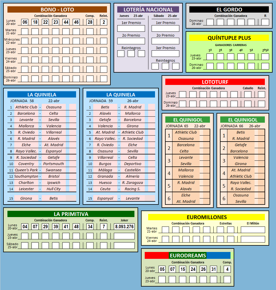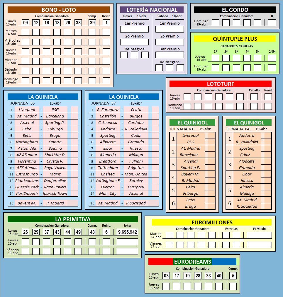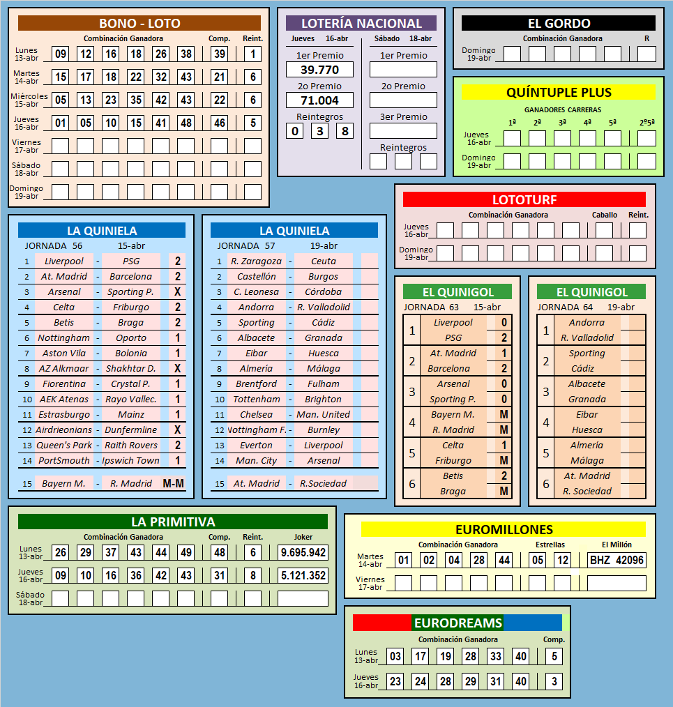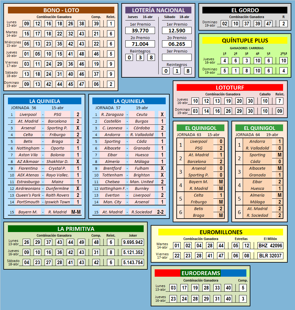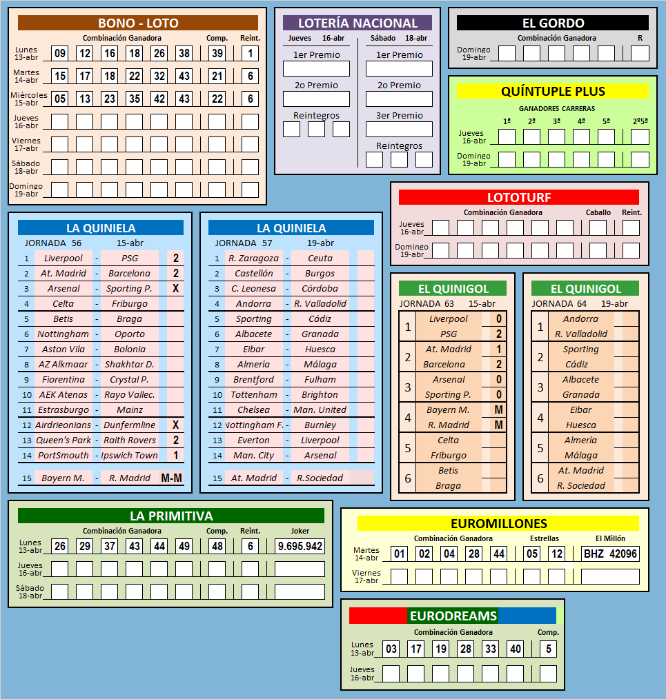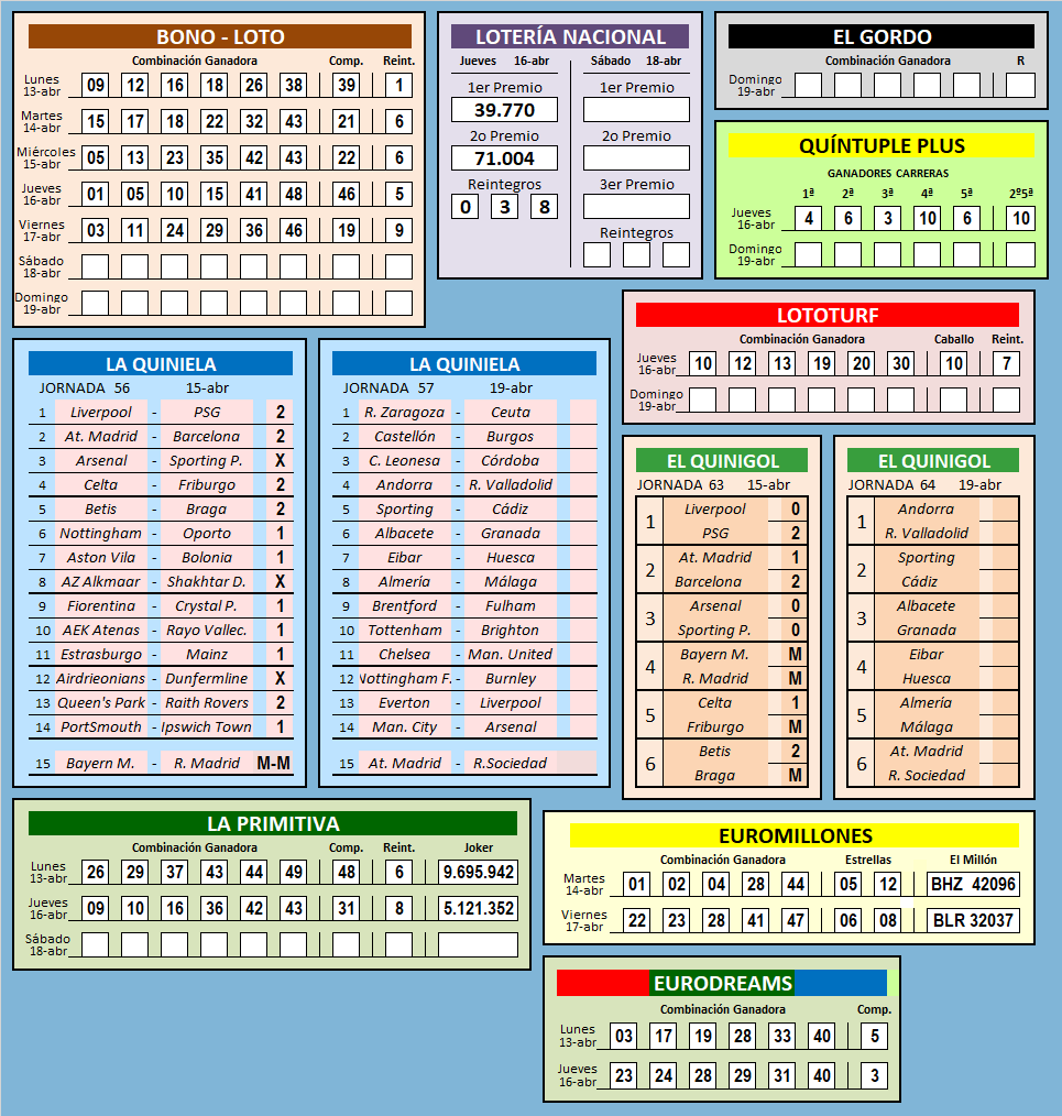 RESULTADOS SEMANA 16 / 2026![]() RESULTADO DE SEMANAS ANTERIORES SEMANA: